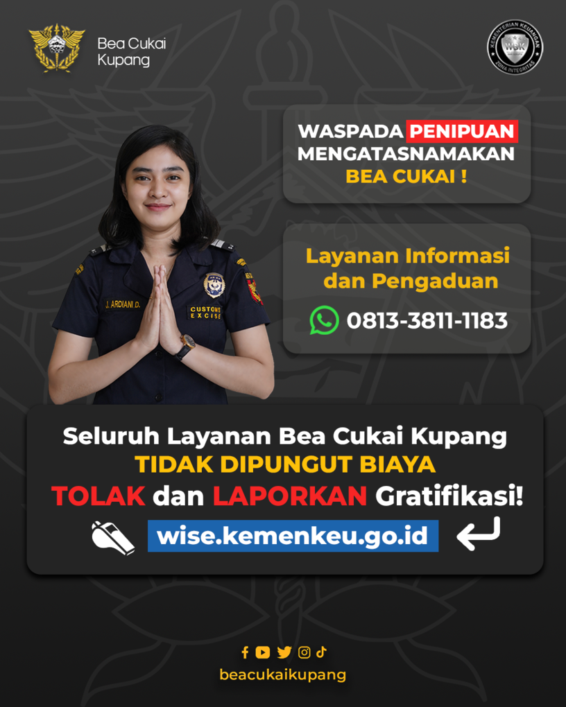 KPPBC TMP C Kupang juga mengajak seluruh masyarakat pengguna jasa untuk bersama-sama menjaga integritas pelayanan dengan tidak memberikan imbalan atau gratifikasi dalam bentuk apa pun kepada petugas Bea dan Cukai.